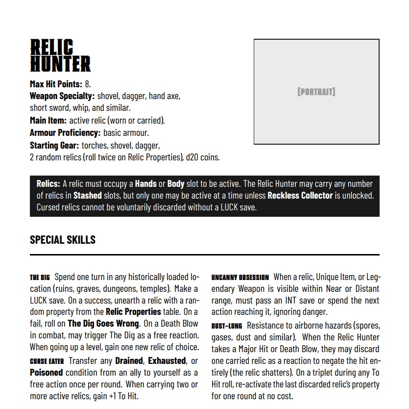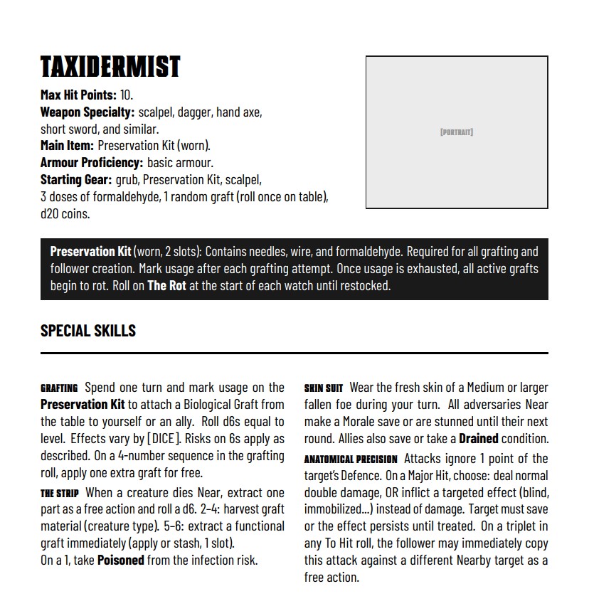 These were made for fun, laughs, and as an experiment in pushing what a FLAIL class can be: a chef who cooks mid-combat, a relic addict who can't leave a room without searching it and a stitching-obsessed guy who keeps lots of spare parts.